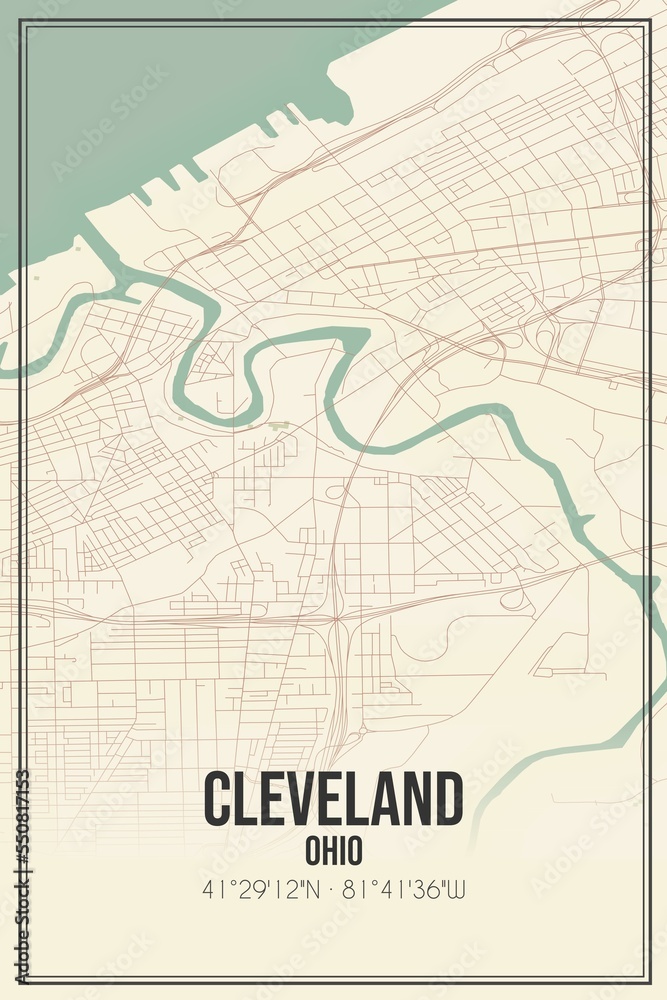 Retro US city map of Cleveland, Ohio. Vintage street map. Stock
